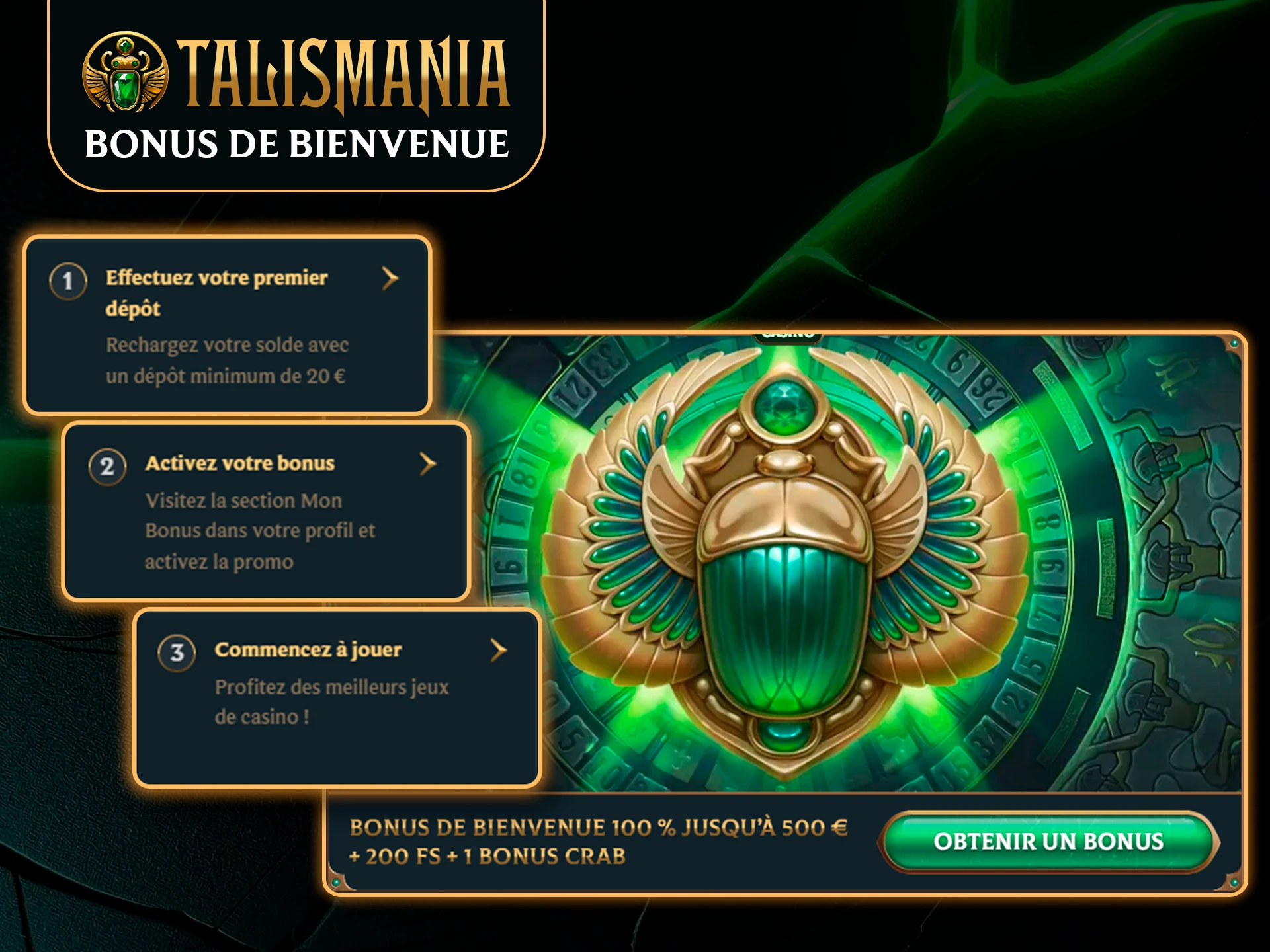 | Bonus de bienvenue | 100 % jusqu’à 500 € + 200 FS + 1 Bonus Crab |
