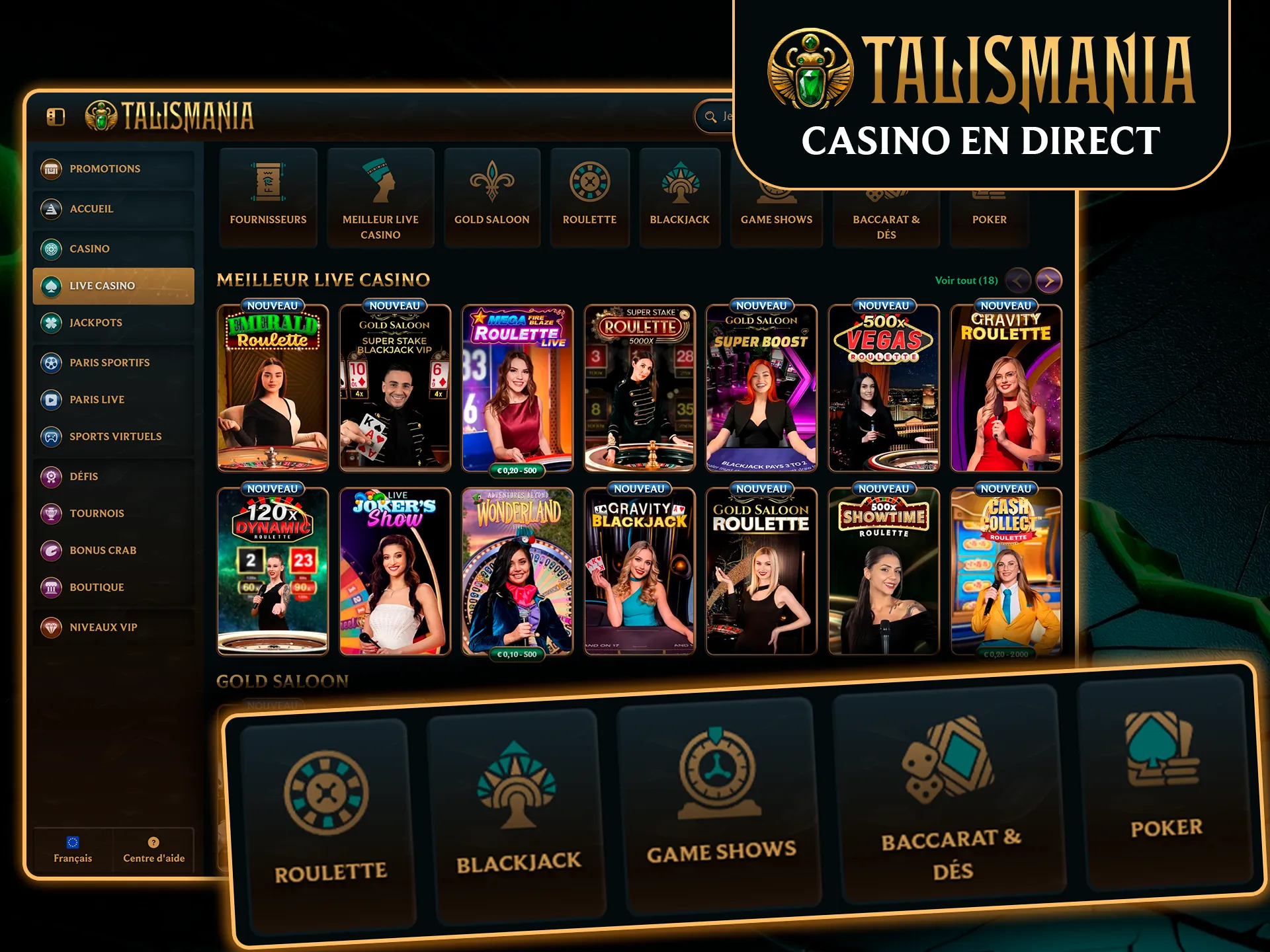 Le casino en direct propose de vraies tables animées par des croupiers, pour une expérience plus immersive que le casino en ligne standard.