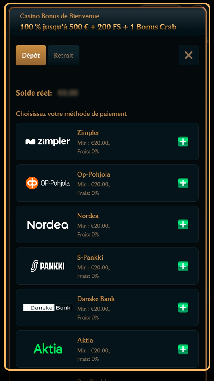 Tu peux activer le Bonus de Bienvenue: 100 % jusqu’à 500 € + 200 FS + 1 Bonus Crab. Conditions d’utilisation et exigences de mise indiquées sur la page Promotion; la contribution des jeux peut varier.