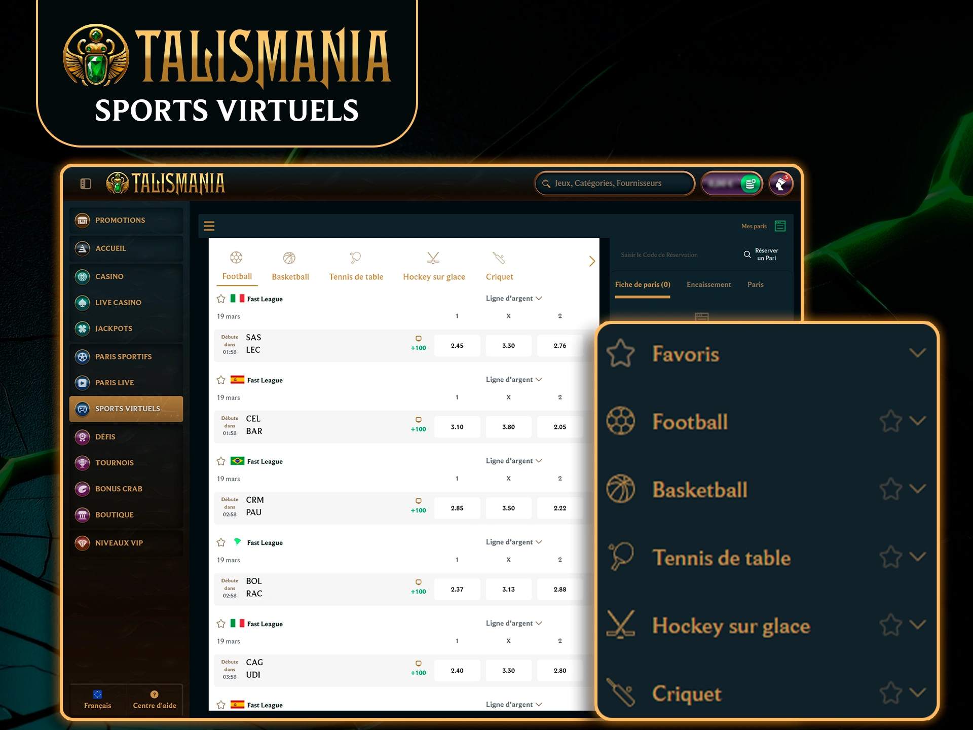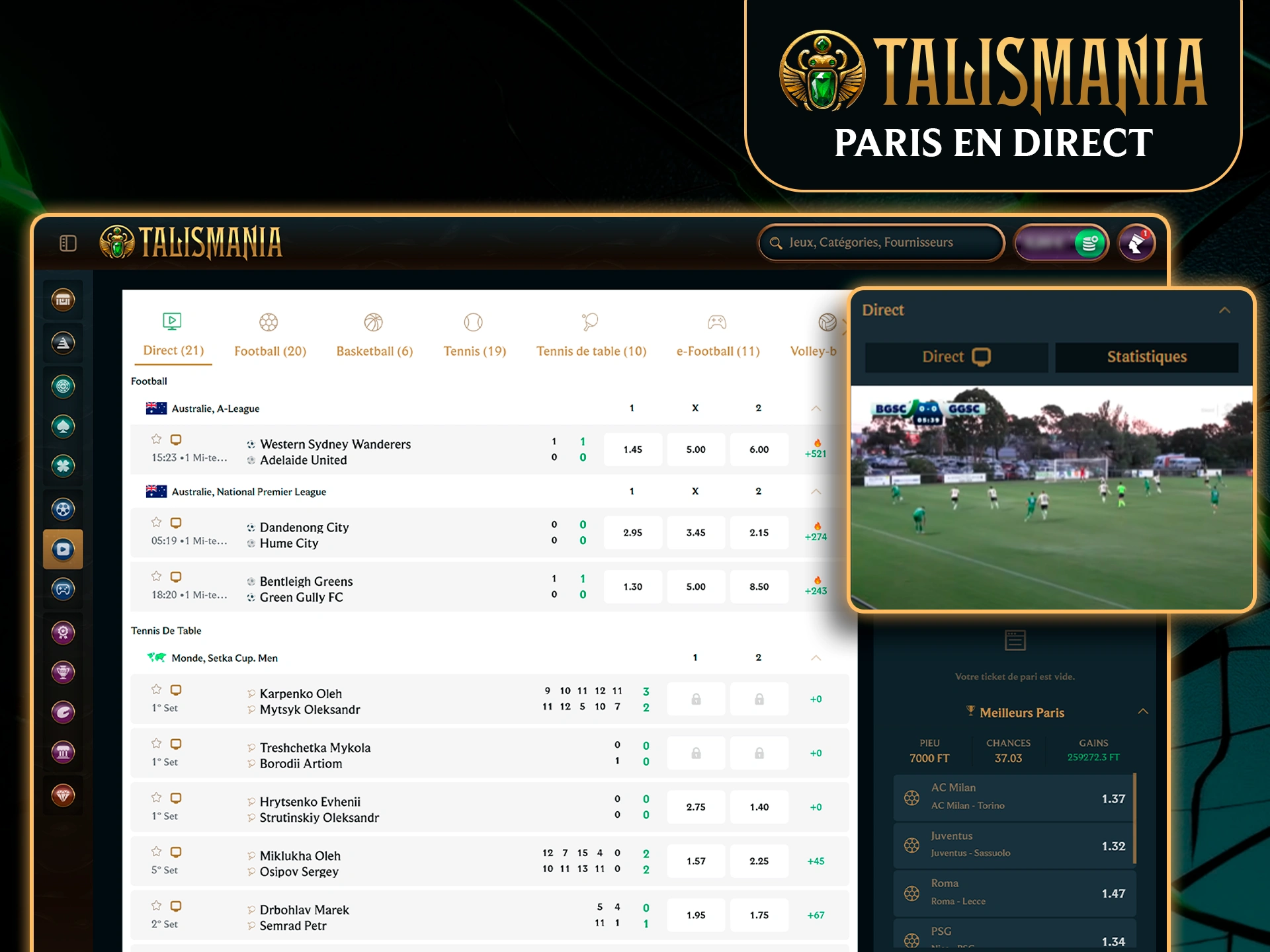 Suis plusieurs événements en direct sur un seul écran et place des paris en temps réel.