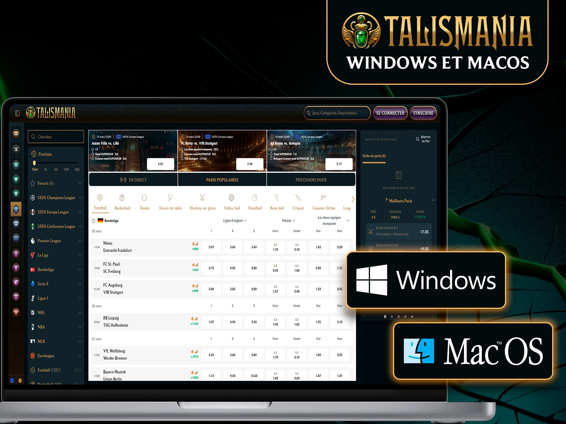 Aucun client à installer n’est requis. Tu peux parier et jouer depuis le site officiel sur Windows et macOS via ton navigateur favori.